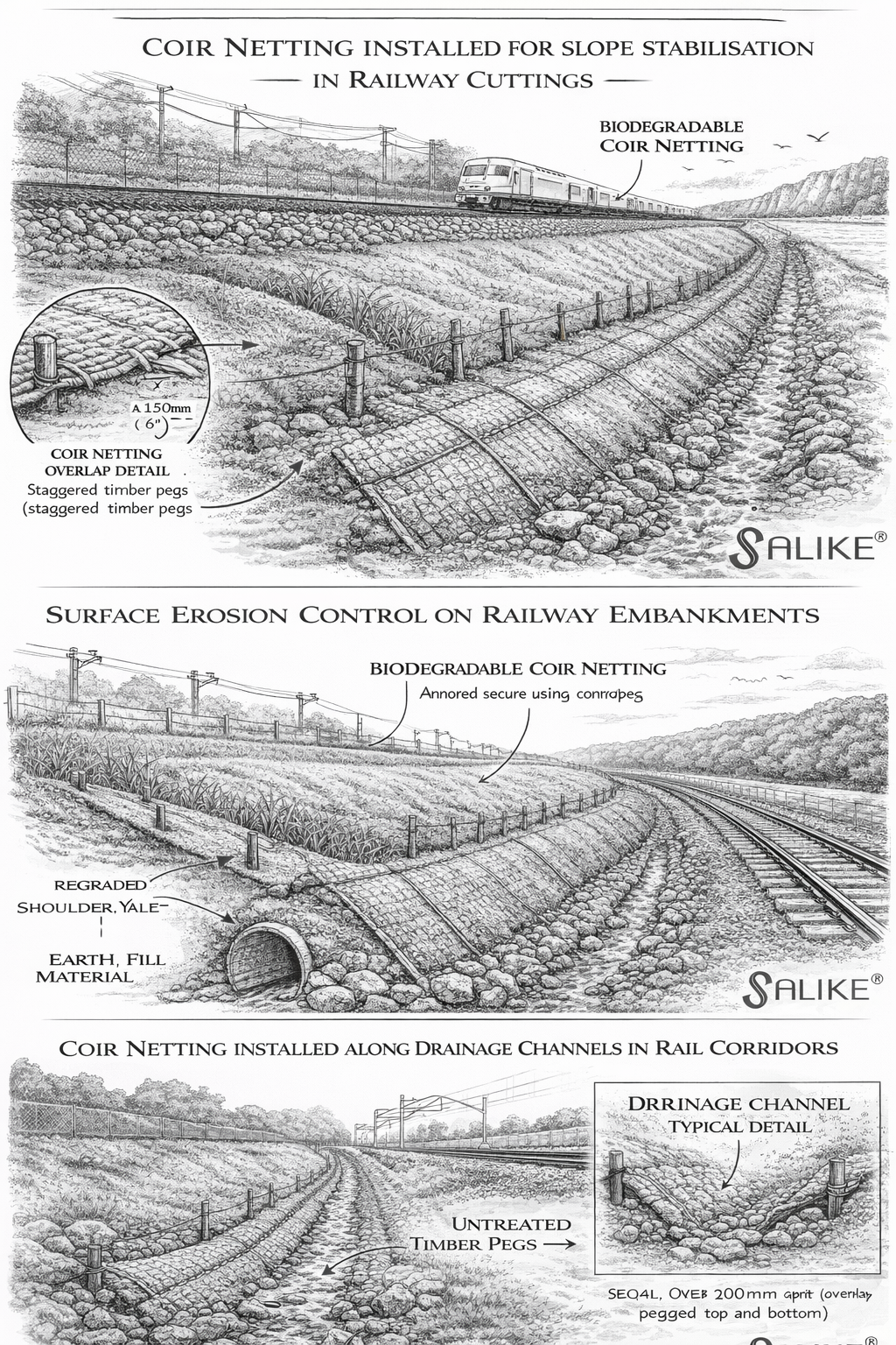 At Salike®, we approach coir netting not as a landscaping accessory, but as a defined engineering component within slope stabilisation strategy — particularly suited to railway cutting slopes, embankment shoulders and transitional drainage zones where surface erosion control is required during vegetation establishment.