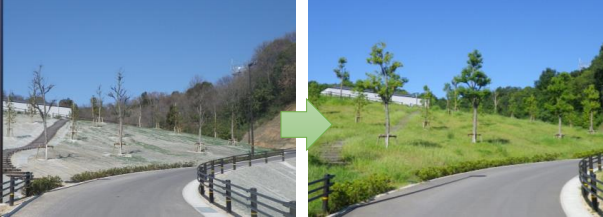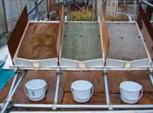 Erosion control test: The erosion control performance of the Drain Sheet against rainfall was tested using an artificial rainfall device (Photo 4.1). The test sections included a control section (bare soil), a Drain Sheet 30 section, and a Vegetation Sheet section. Each section was subjected to a rainfall intensity of 100 mm/h for a duration of 60 minutes. During the test, the volume of drainage, the clarity (transparency) of the drainage water, and the volume of outflow soil were measured at 5-minute intervals.