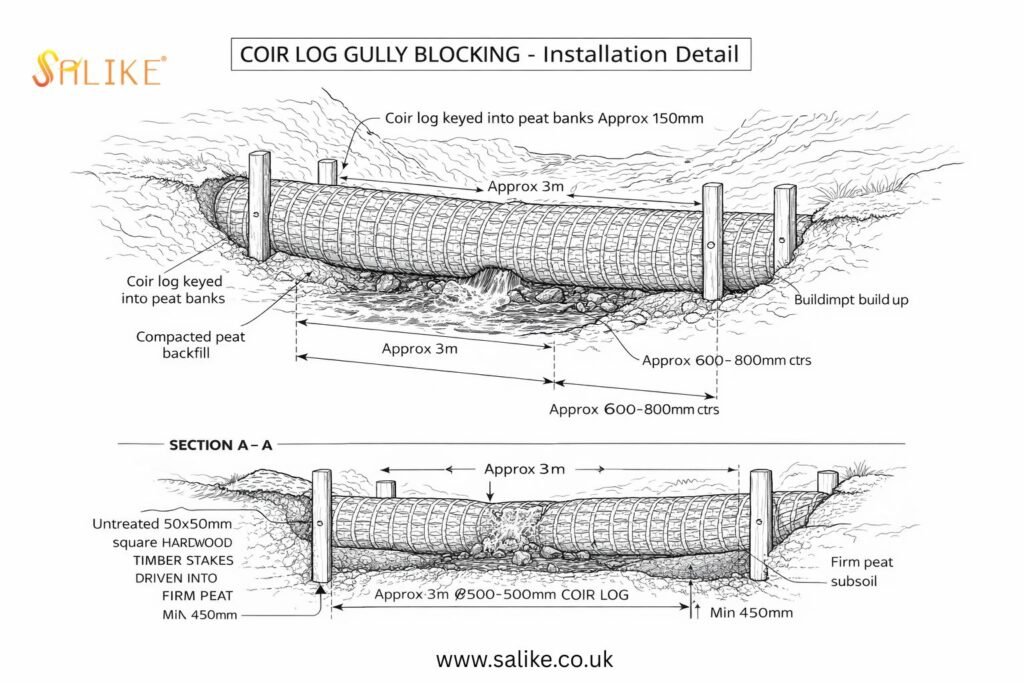 Engineered coir logs offer a measured and effective solution for peatland gully blocking. Installed transversely across erosion channels, they slow water velocity, encourage sediment deposition and assist in re-wetting the peat body upstream of the intervention.